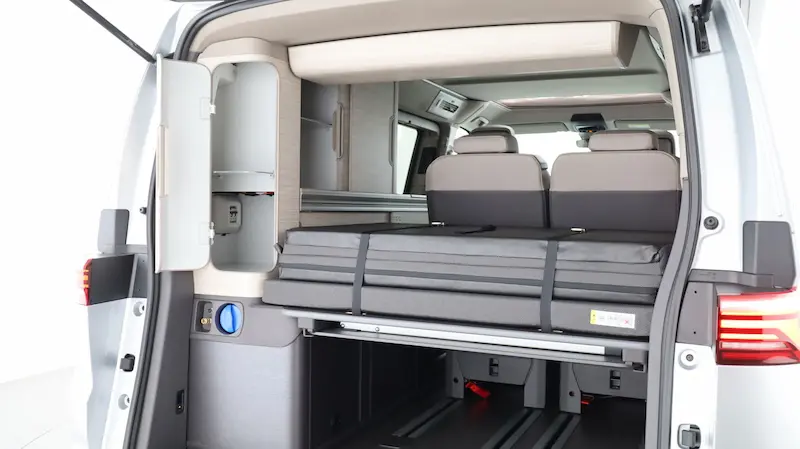 Notre flotte de vans aménagés, dont le Volkswagen California, propose plusieurs configurations selon les modèles : 2 à 4 places assises et couchages optimisés pour couple, famille ou amis. Chaque véhicule dispose d’un toit relevable, d’une cuisine équipée et de rangements pratiques.